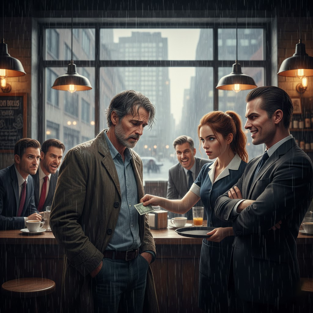Four days later, the café hummed with its usual morning rhythm, yet an invisible tension clung to Emma. The stares felt like physical weights. Then, the chime of the doorbell. A tall man, impeccably dressed in a charcoal suit, entered. His salt-and-pepper hair was meticulously combed, his polished shoes tapping a rhythm of purpose. He walked not to the counter, but to the very table where the old man had once sat, a ghost of humiliation. Emma’s heart hammered. It was him.