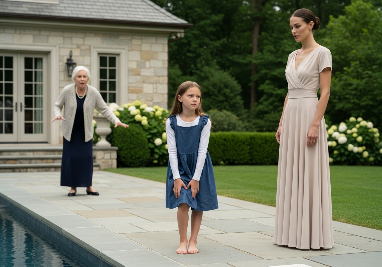 The rope caught on the heel of her shiny dress shoe. Lily pitched forward. It wasn’t a small stumble; she went down hard. Her knees slammed into the rough slate edge of the pool coping.