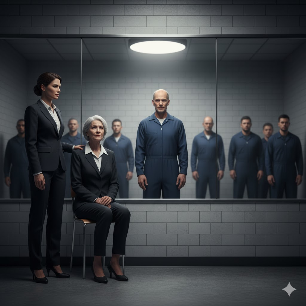 The room was cold—too cold for a child. A faint buzzing came from the flickering fluorescent lights overhead. On one side of the glass, a lineup of nine men sat silently on plastic chairs. On the other side, a little girl with tangled hair swung her feet back and forth on the wooden bench. Her tiny hand clutched the sleeve of her mother’s cardigan. Her name was Emily Carter. She was seven years old, and she was about to change everything.
