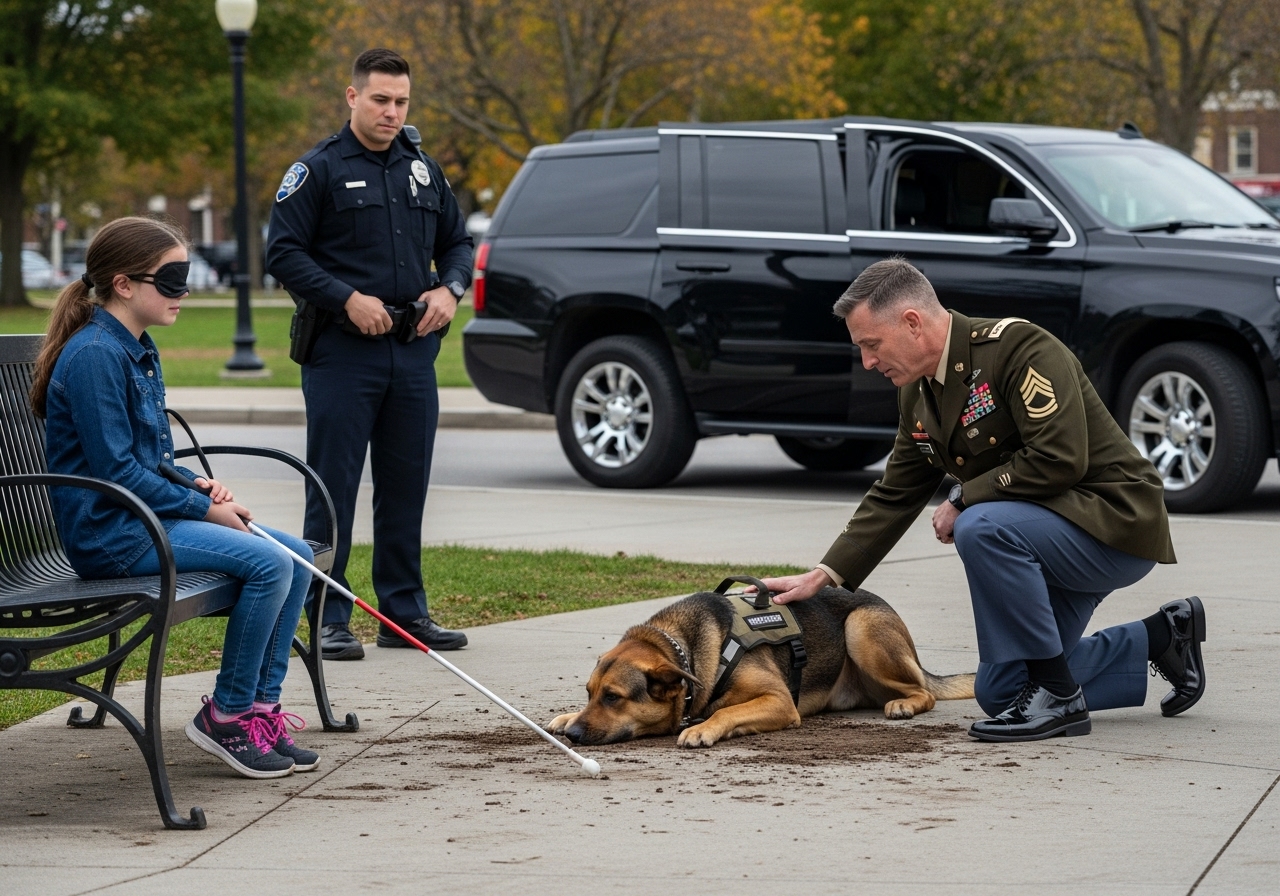 The dog, Sergeant, didn’t move. He was a massive animal, his muzzle graying with age, his left ear tattered from an old injury that had taken a piece of the cartilage. He wore a service vest that looked as tired as he did—frayed at the edges, the “SERVICE DOG” patches faded from years of sun exposure. To the untrained eye, he looked like a stray that someone had dressed up. But to Lily, he was the center of the universe. He was her eyes, her shield, and the only living connection she had left to a father she could barely remember.