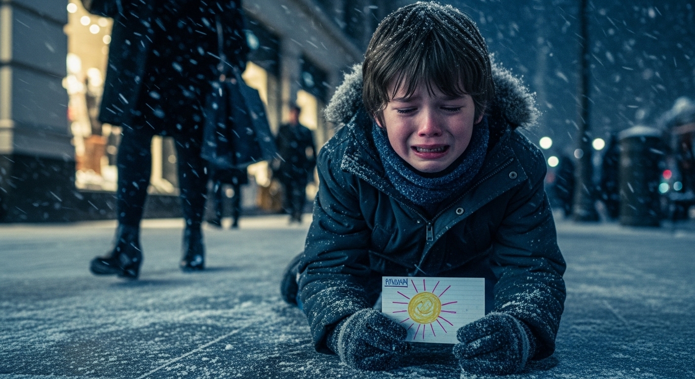 It was a disaster in slow motion. The drawings—the angels, the stars, the hearts that Leo had spent hours drawing by the light of a streetlamp—scattered like confetti. They swirled into the wet, brown slush. The wind whipped them into the gutter. In seconds, the “inventory” was ruined, soaked, and trampled by the oblivious crowd.